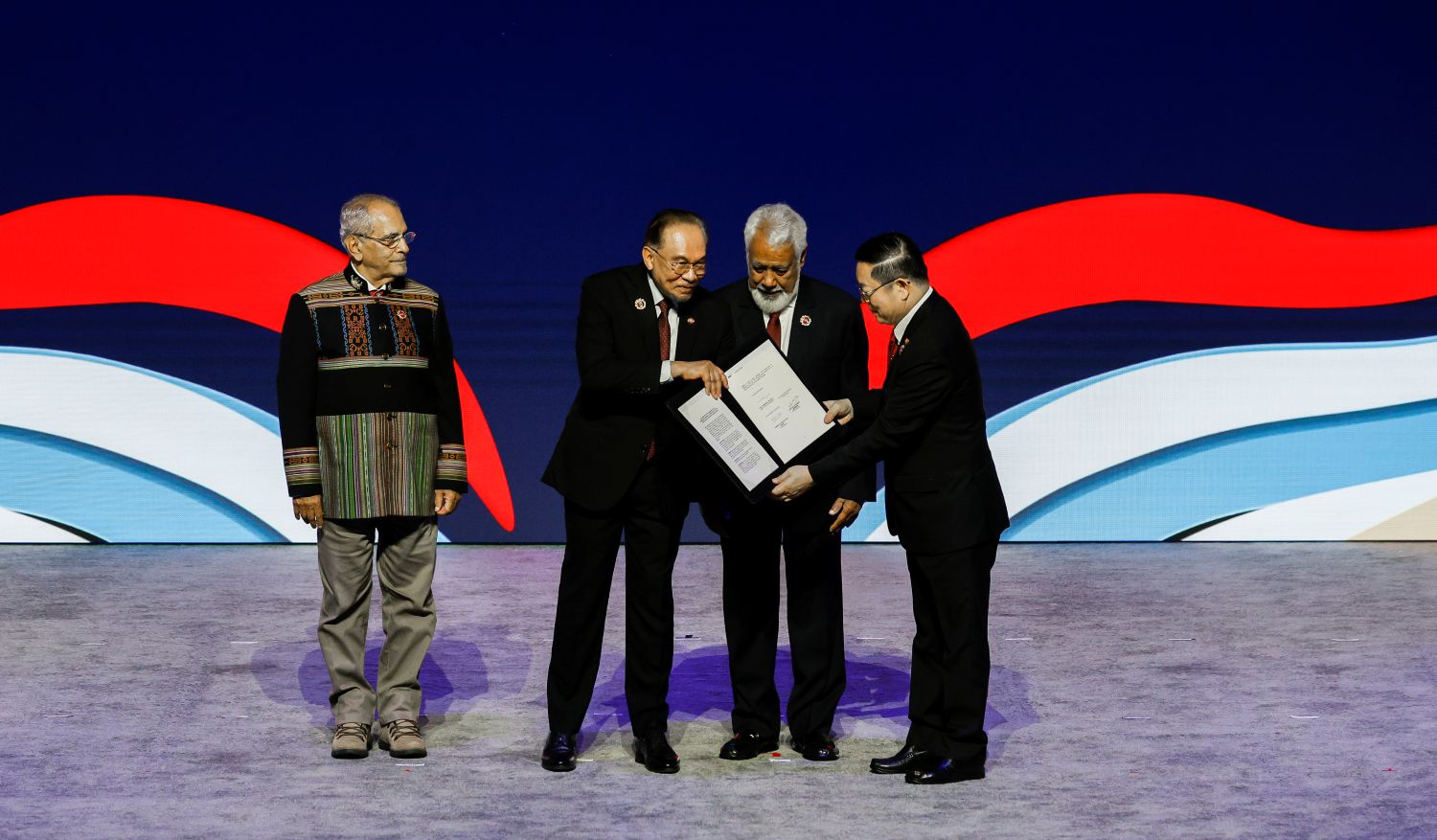 Perdana Menteri, Datuk Seri Anwar Ibrahim menyerahkan dokumen deklarasi Timor-Leste menganggotai ASEAN kepada Setiausaha Agung ASEAN, Dr. Kao Kim Hourn (paling kanan), sambil disaksikan Presiden Timor Leste, Jose Ramos Horta (kiri) dan Perdana Menteri Timor Leste, Kay Rala Xanana (dua dari kanan) pada Sidang Kemuncak ASEAN ke-47 di Kuala Lumpur hari ini. Foto oleh SHIDDIEQIIN ZON / KOSMO!Beliau berkata, dengan sistem demokrasi ini, Timor-Leste adalah lebih terbuka untuk pembangunan ekonomi masa hadapan.