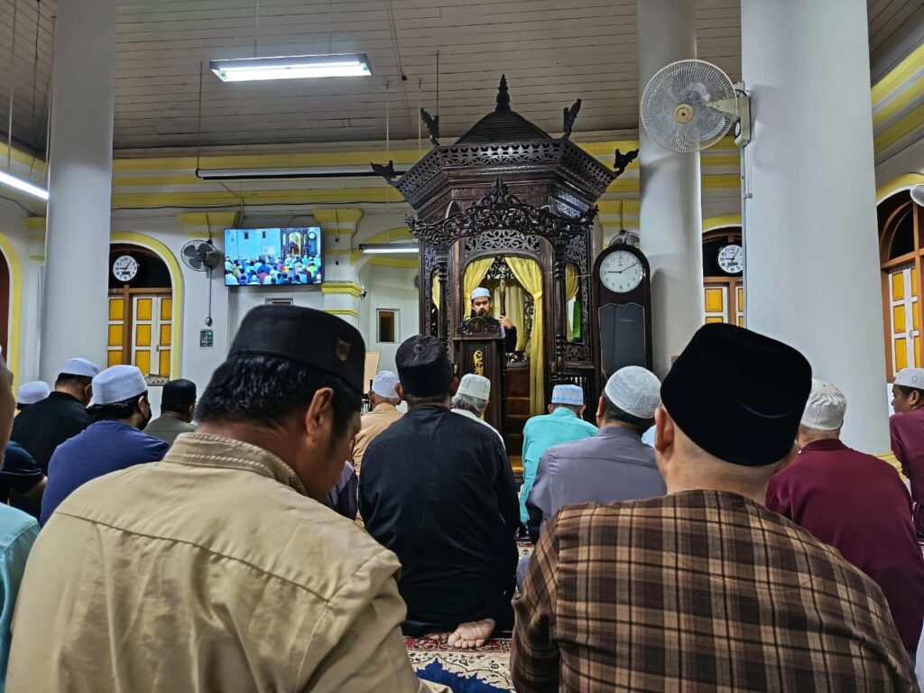 Imam Wan Ahmad Shahid Wan Abdullah Lutfi (tengah) sedang menyampaikan khutbah gerhana bulan di Masjid Hiliran, Kuala Terengganu malam ini.“Kami juga menunaikan solat fardu maghrib dan isyak serta solat sunat gerhana bulan dan tarawih berjemaah. Gerhana bulan penuh ini hanya akan dapat dilihat semula pada 31 Disember 2028,” katanya. – KOSMO! ONLINE