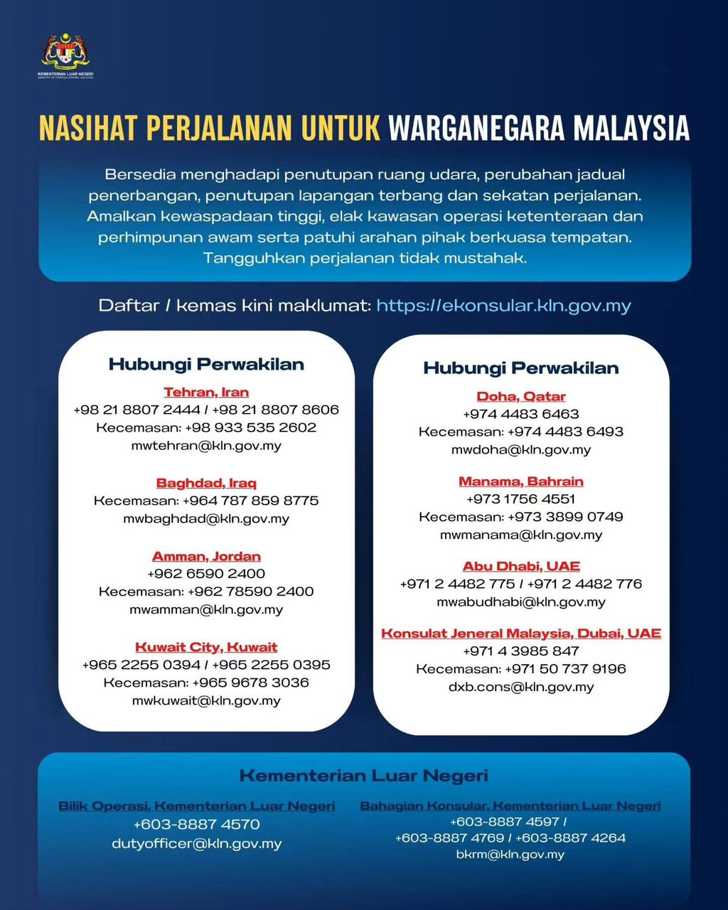 Dalam masa sama, rakyat Malaysia di luar negara digesa untuk mendaftar dan mengemas kini maklumat keberadaan masing-masing menerusi sistem e-Konsular di pautan https://ekonsular.kln.gov.my bagi memudahkan pihak berkuasa menyalurkan bantuan sekiranya berlaku kecemasan.